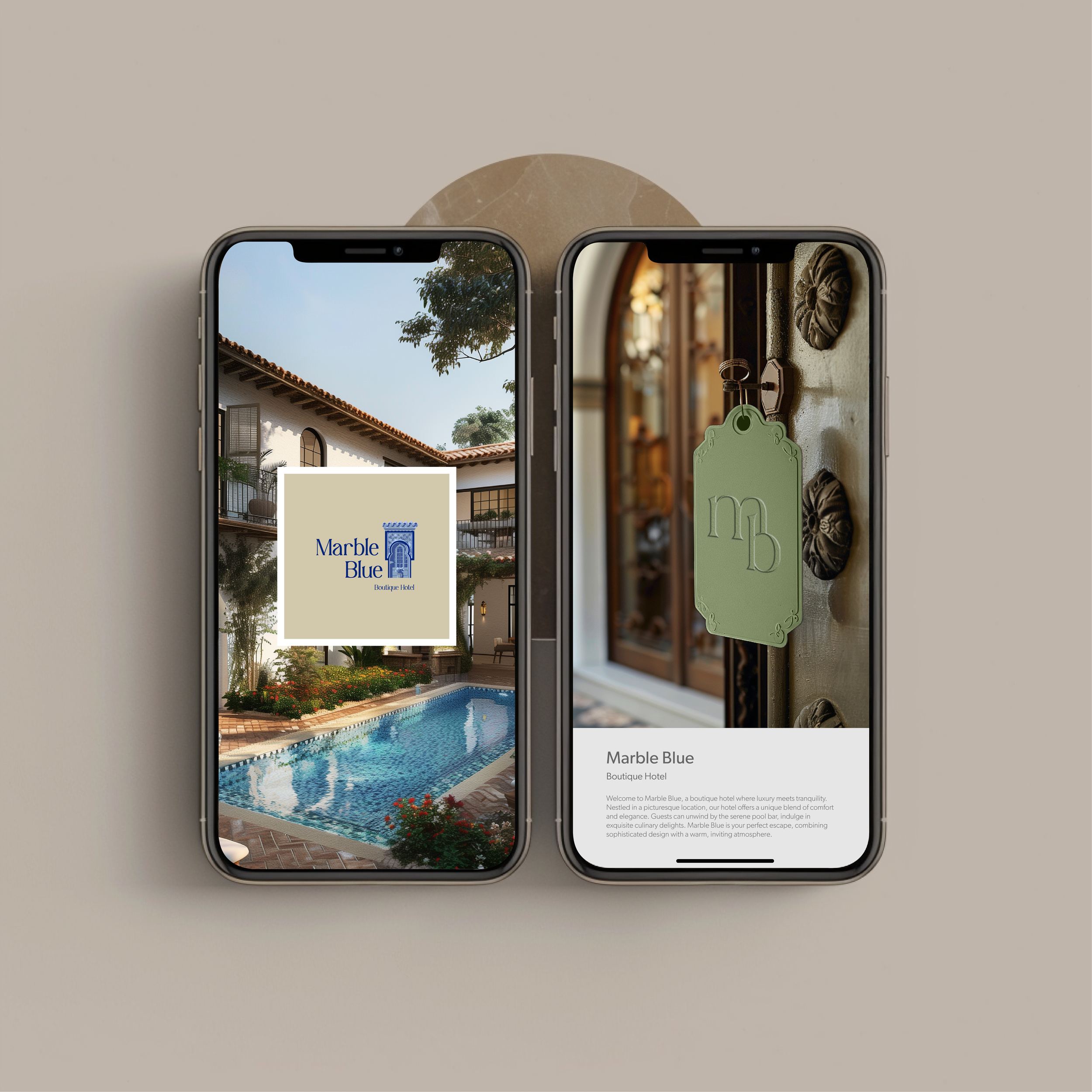 Instagram feed and story mockups were created with placeholders for future content, maintaining the Spanish-style boutique vibe. Additionally, mockups for the pool and hotel keys were developed to enhance the branding experience. These mockups aimed to highlight Marble Blue’s blend of luxury and relaxation, fitting seamlessly into the overall brand aesthetic.